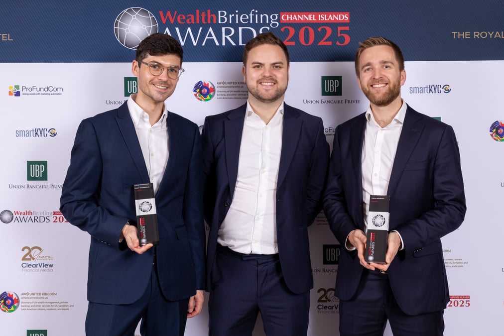 (L-R) Landytech's Ben Goble, Hugh Porter and Matthew King accept the Client Reporting and Client Accounting awards at the 2025 WealthBriefing Channel Island Awards in Jersey