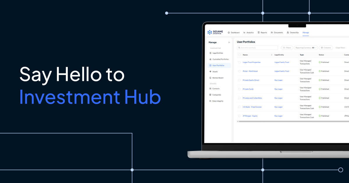 Investment Hub is a powerful and intuitive tool within Sesame to manage all aspects of your investment portfolio. Whether you need to make minor adjustments to data that has arrived through a custodian feed, upload the latest transactions in your private equity portfolio, or manage a custodied portfolio in the unlikely case an automated data feed is not feasible. Investment Hub provides you with more control and flexibility than ever before, while saving you time as you keep your single source of truth up to date.